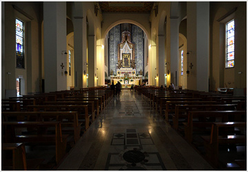Giunti nel piazzale, all’estremità ovest si entra nella nuova Basilica che iniziata nel 1952 è stata aperta al culto solo nel 1961. Lo stile architettonico della Basilica è romanico: all’interno la struttura è a tre navate, il soffitto a cassettoni con doratura in oro zecchino e il pavimento in granito semilucido. In fondo alla navata centrale vi è il presbiterio, su di esso in alto vi sono due matronei. Addossato alla parete di fondo, s'innalza il nuovo monumentale trono dove è stata posta l'immagine della Madonna. Si tratta di una pittura restaurata che risale al XII sec. di cui si contendono la paternità il d’Arezzo e il Cavallini. Il trono è adornato da marmi pregiati, statue e bassorilievi di bronzo su uno sfondo di mosaico monocromo.