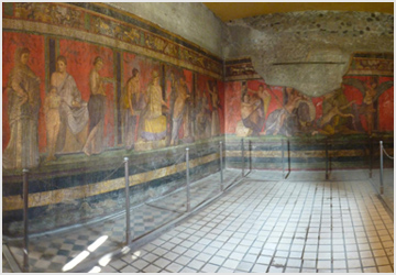 - 30- Villa dei misteri: Pompei deve molta della propria fama a questo complesso, straordinario non solo per la distribuzione planimetrica degli spazi interni ma anche per la decorazione pittorica. Il nucleo originale della residenza risale alla prima metà del sec. II a.C., ma venne rimaneggiato attorno al 60 a.C. (a tale intervento si devono i dipinti) e adattato in parte a villa rustica in età imperiale. La decorazione in terzo stile del tablino e i brani di pitture di paesaggio nell’atrio sono una sorta di introduzione e di preparazione al ciclo pittorico del triclinio posto a destra del tablino; il più vasto giuntoci dall’antichità (m 17 x 3), venne realizzato da un artista campano aperto agli influssi delle pitture greche di epoca classica ed ellenistica: Dioniso e Arianna in trono fungono da perno della rappresentazione di riti orfico-dionisiaci, raffigurati nelle varie fasi sopra una sorta di podio e con sullo sfondo una finta incrostazione marmorea. L’insieme è ancora oggi oggetto di discussione circa il significato dei singoli riquadri: secondo alcuni la scena di toeletta indicherebbe l’iniziazione femminile al matrimonio, secondo altri tutto il ciclo si riferirebbe alla nascita di Dioniso, simbolo delle forze irrefrenabili della natura, il cui culto fu da sempre circondato da mistero.